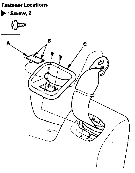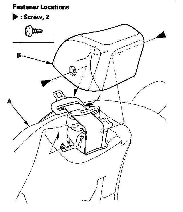 9. Using the appropriate trim tool, pry out on the front belt trim cap (A) to release the hooks (B), then remove the screws securing the shoulder front seat trim (C).