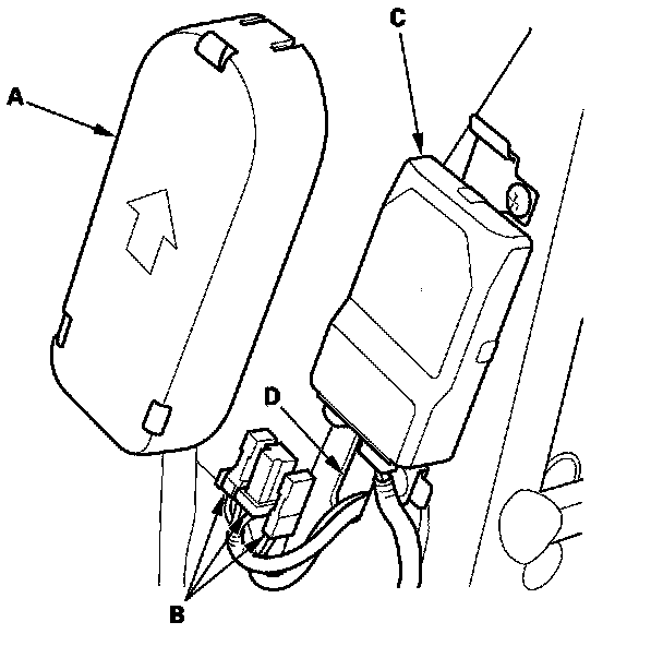 11. Passenger's seat: Remove the ODS unit cover (A), and disconnect the OPDS sensor connectors (B) from the ODS unit (C), and pull them in through the hole (D) in the seat frame.