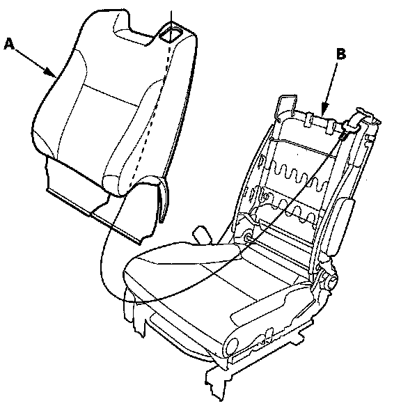 14. Remove the seat-back cover/pad (A) from the seat-back frame (B).