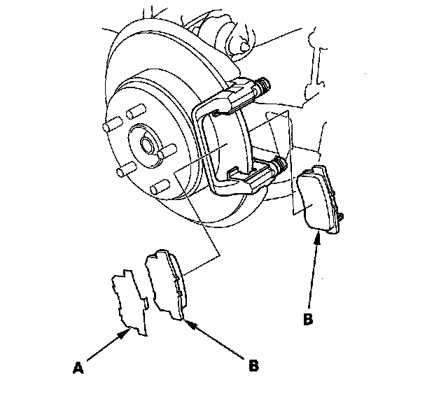 5. Remove the pad shim (A) and brake pads (B).