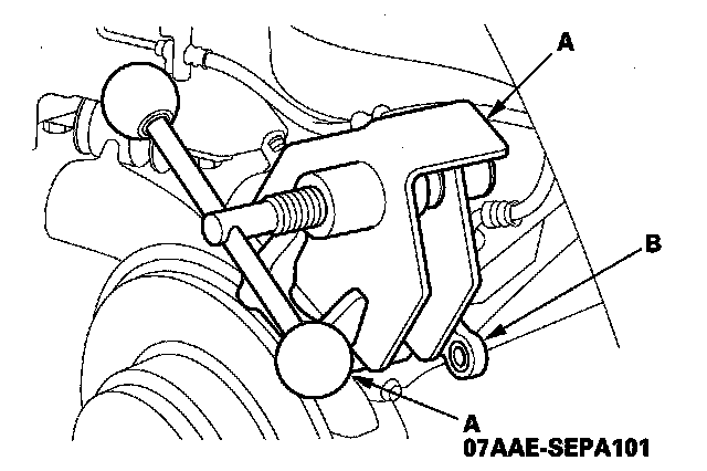 16. Install the caliper and the flange bolts (A), and tighten them to the specified torque while holding the caliper pin (B) with a wrench. Be careful not to damage the pin boots.
