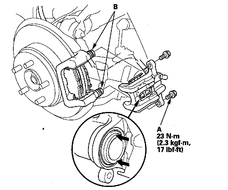 7. Clean the caliper bracket (B) thoroughly; remove any rust, and check for grooves and cracks.