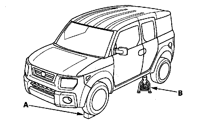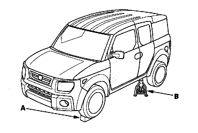 1. Block the front wheels (A), raise the left rear wheel, and support it with a safety stand (B) as shown.