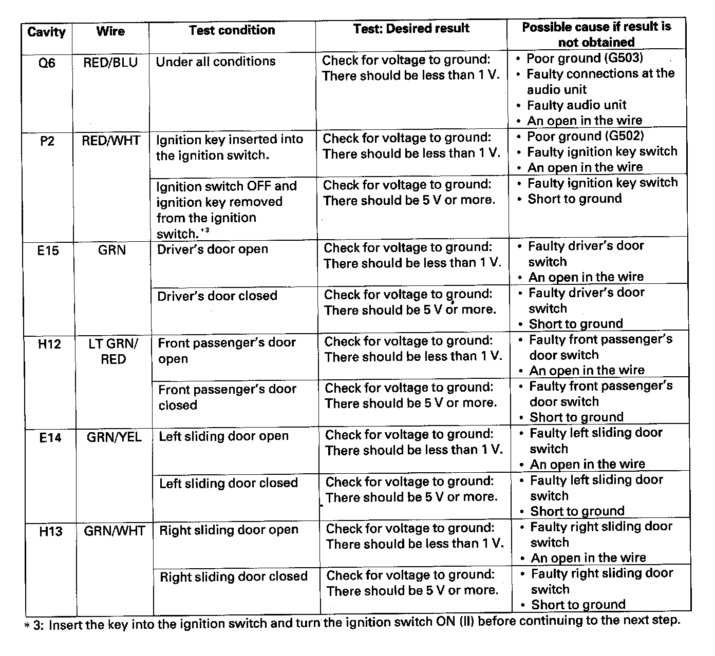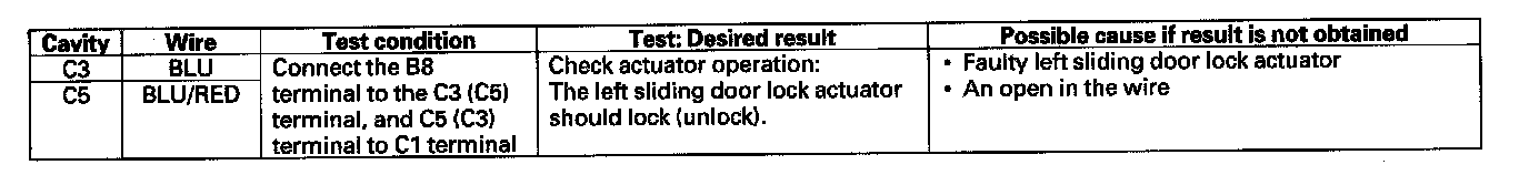 24. Reconnect the connector to the door multiplex control unit. Turn the ignition switch ON (II) and make these input tests at the connectors.
