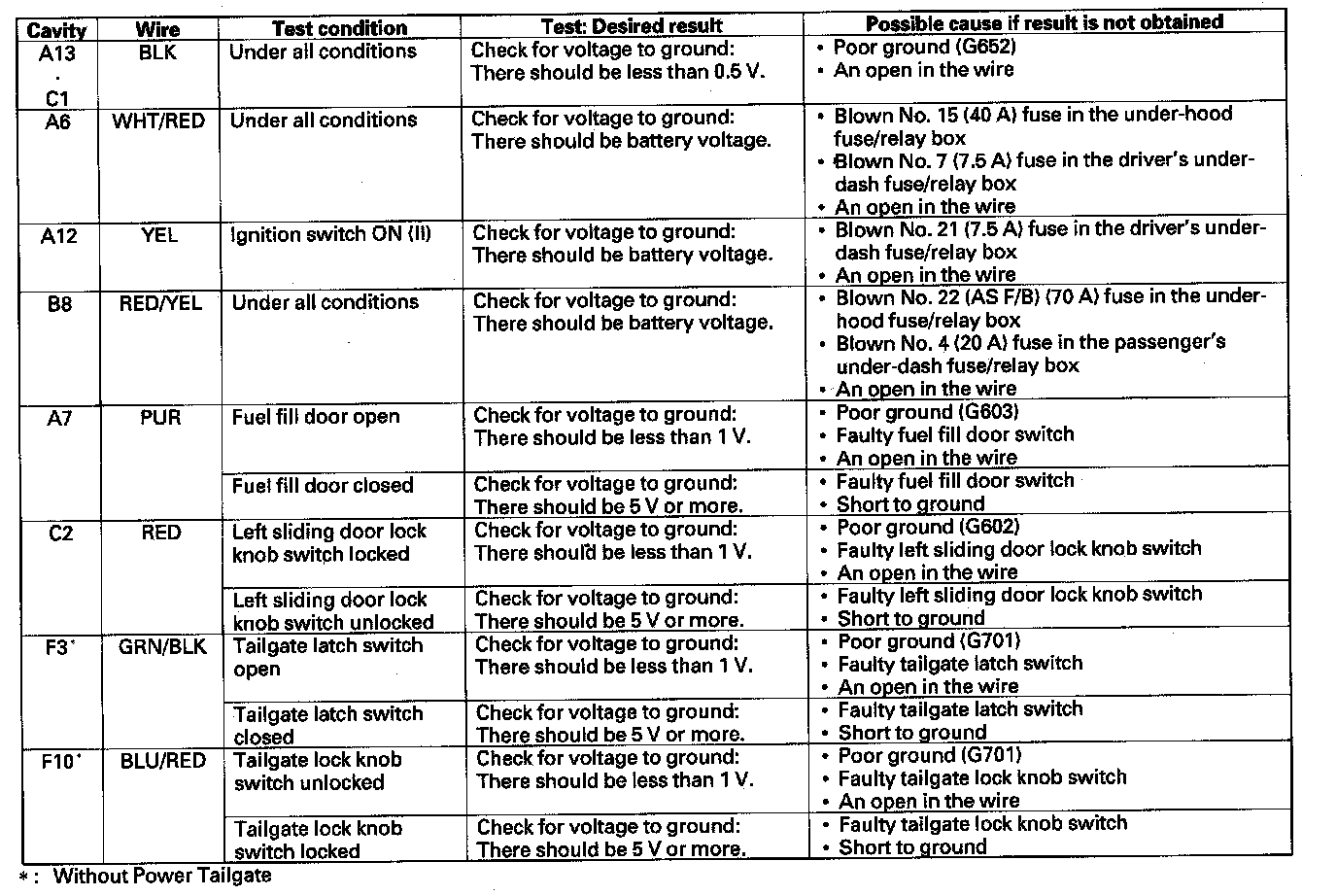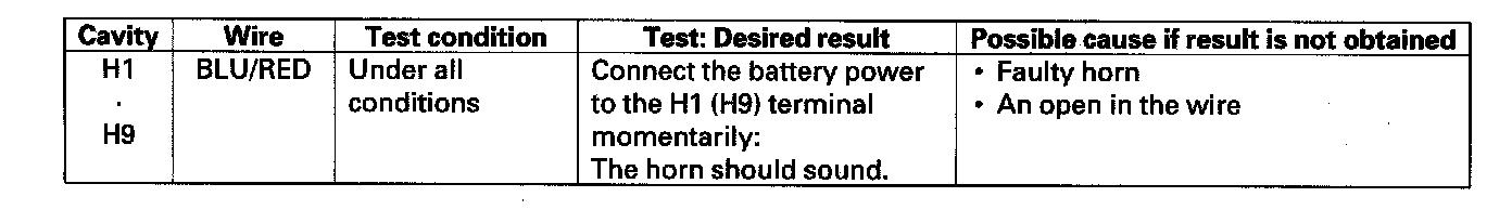 6. Reconnect all connectors to the driver's under-dash fuse/relay box. Turn the ignition switch ON (II), and make these input tests at the appropriate connectors on the driver's under-dash fuse/relay box.