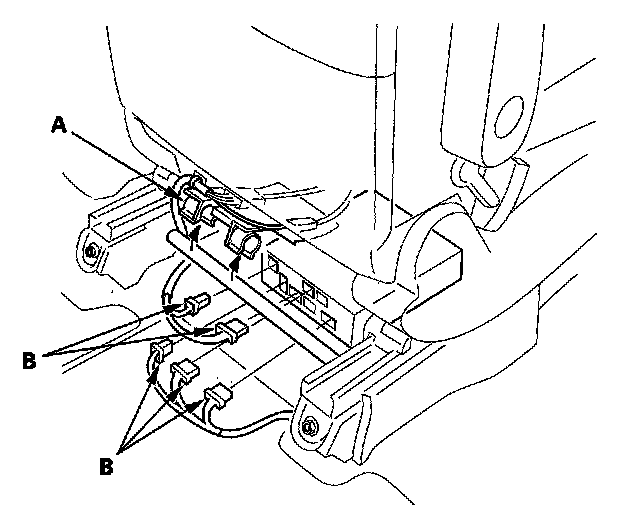 5. Lift up the rear of the seat connectors mounting clip (A), and disconnect the navigation unit connectors (B).