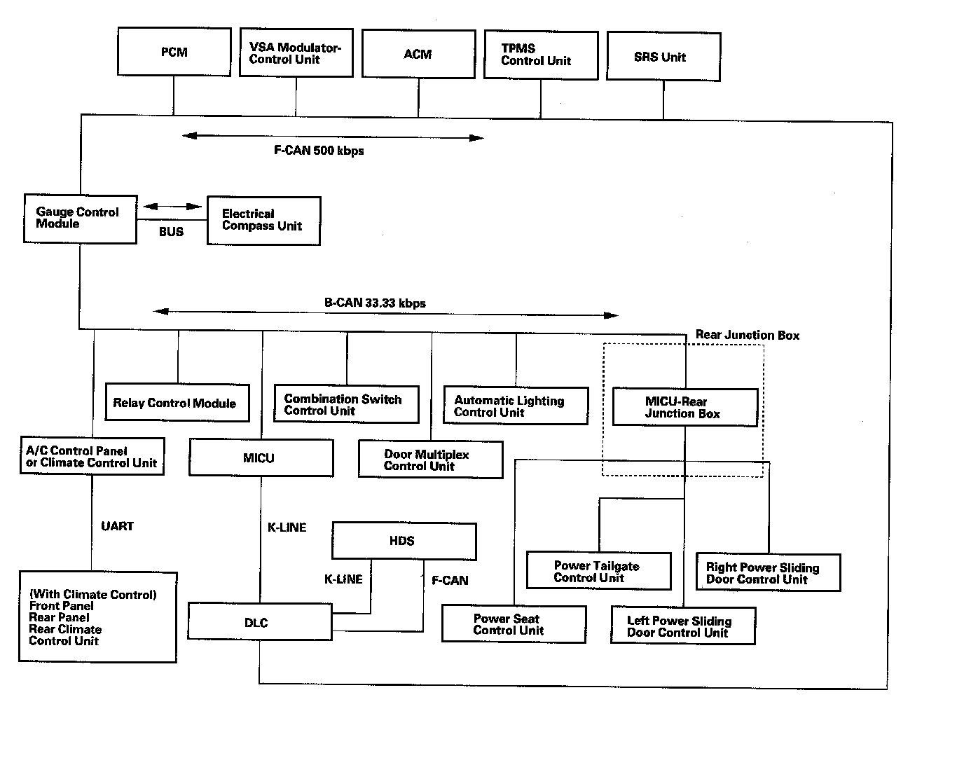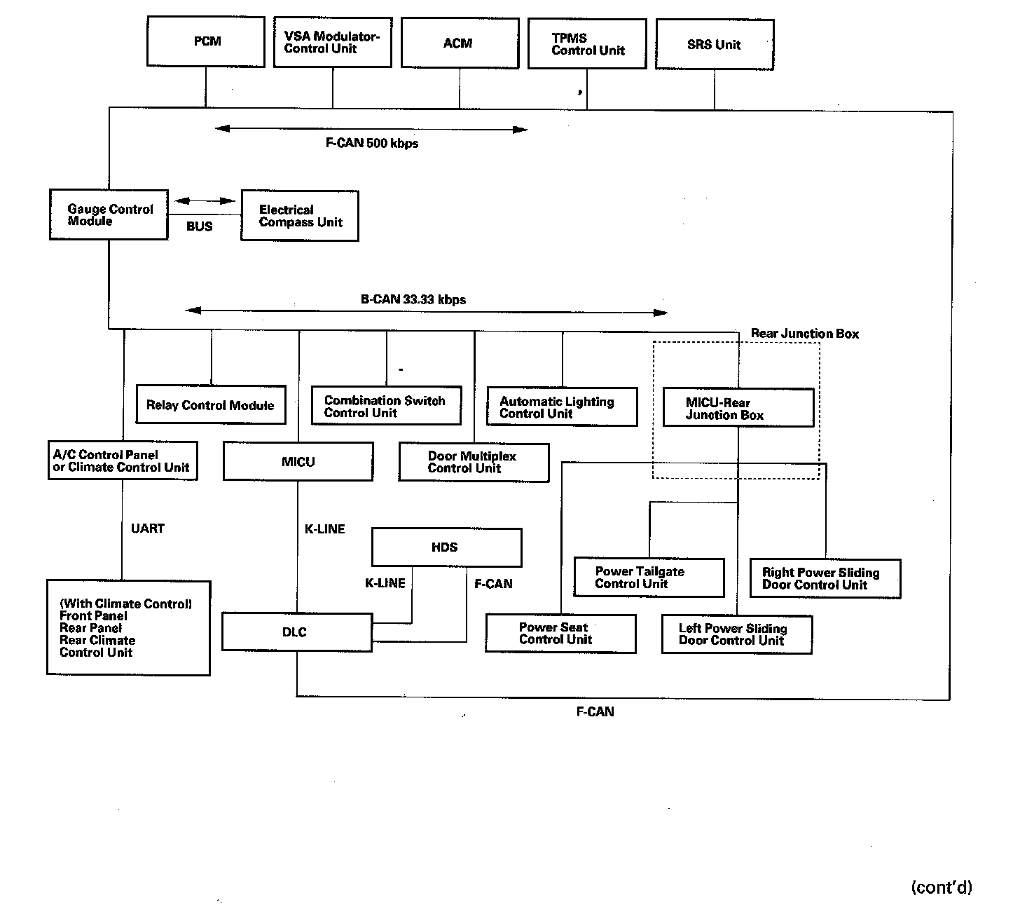 The body controller area network (B-CAN) and the fast controller area network (F-CAN) share information between multiple electronic control units (ECUs). B-CAN communication moves at a slower speed for convenience related items and for other functions. F-CAN information moves at a faster speed for "real time" functions such as fuel and emissions data. To allow both systems to share information, the gauge control module translates information from B-CAN to F-CAN and from F-CAN to B-CAN.
