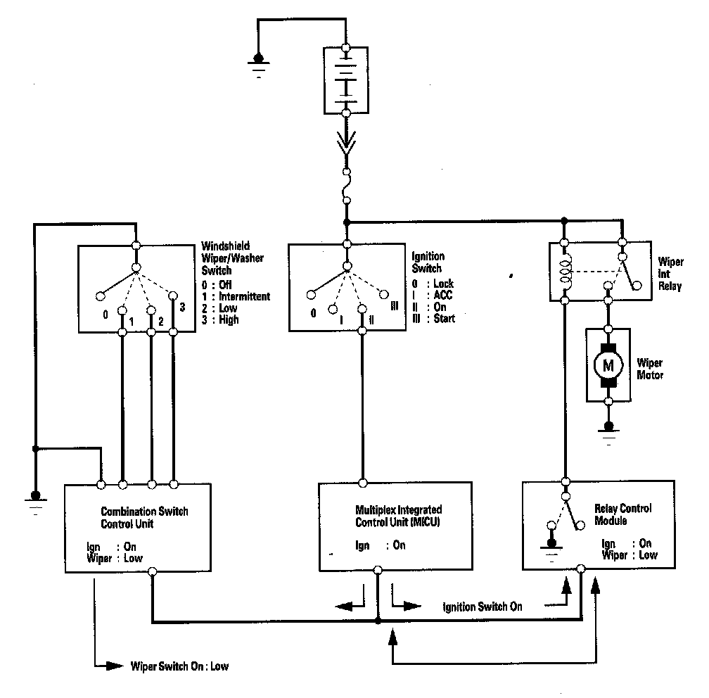 Messages are transmitted by an ECU (that monitors an input) over the communication circuit. ECUs that use the message (information related to that input) are the receivers. For example, the combination switch control unit monitors the wiper switch. When the wiper switch is placed in the low speed position, the combination switch control unit transmits that message on the communication circuit. The relay control module receives the message and turns on the wipers by providing a ground for the relay.