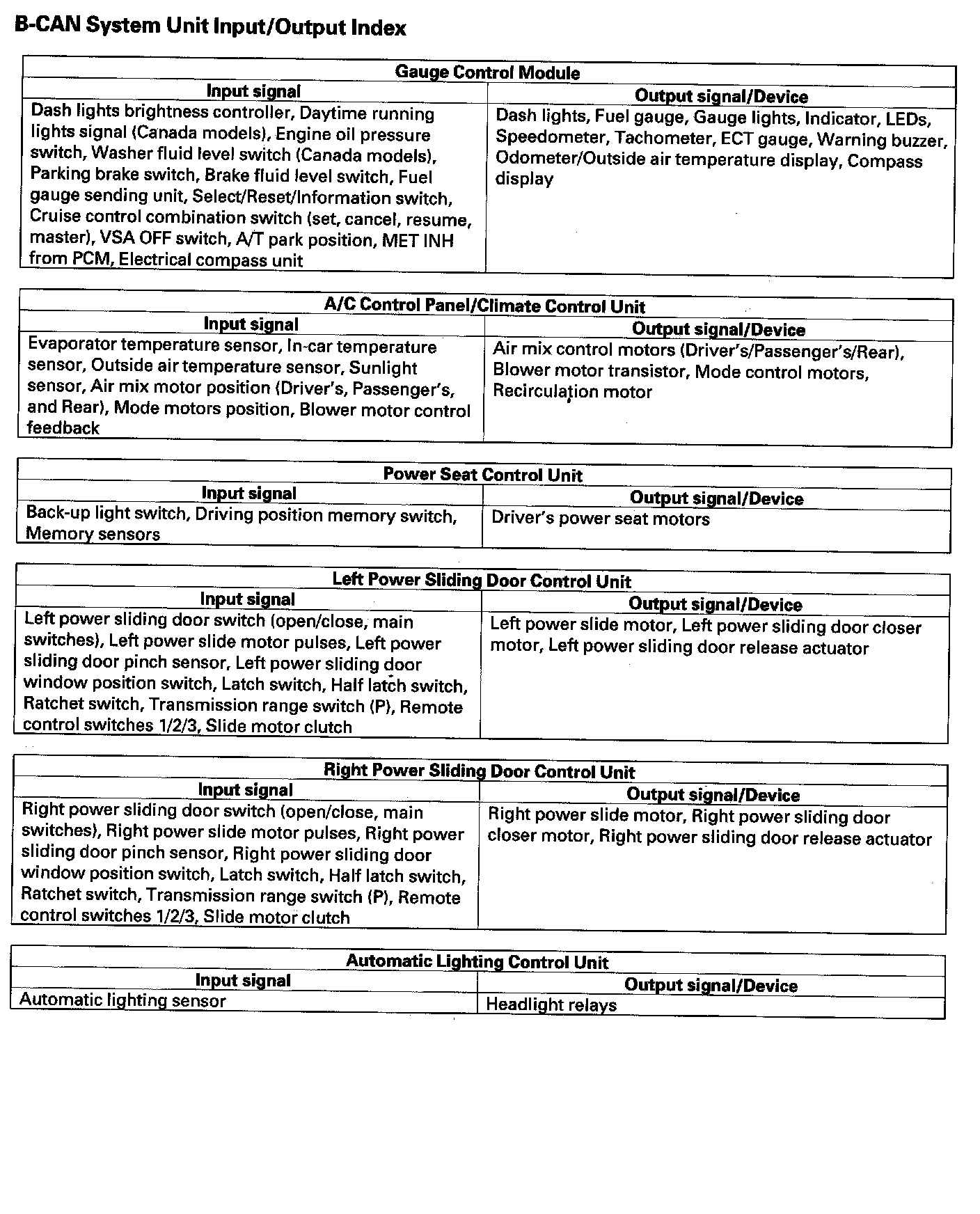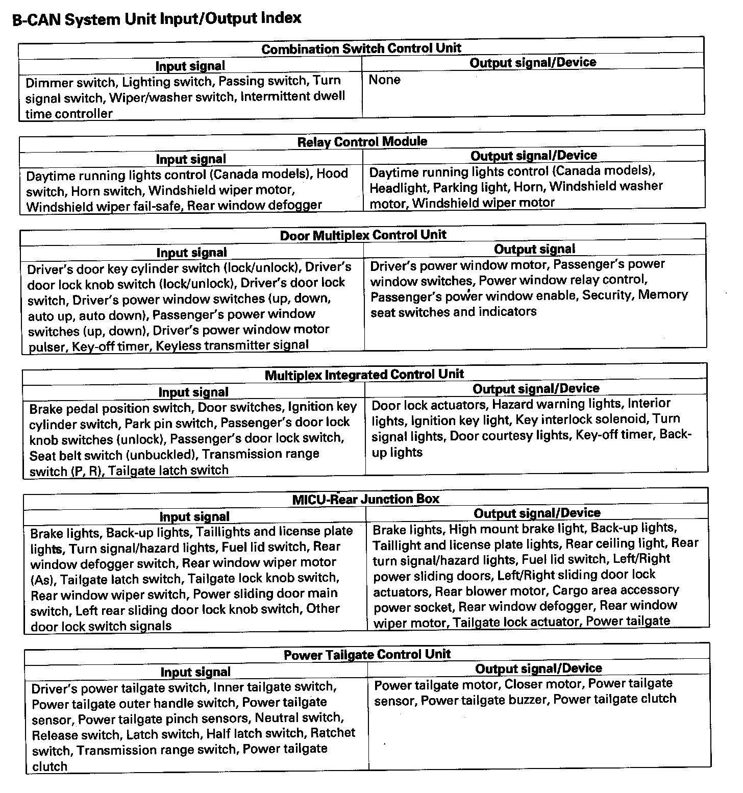 B-CAN System Unit Input/Output Index Part 2: