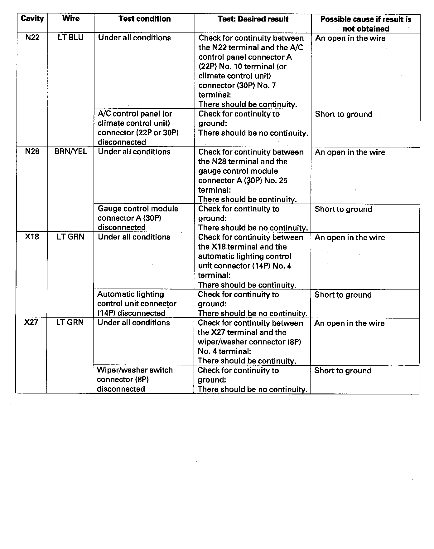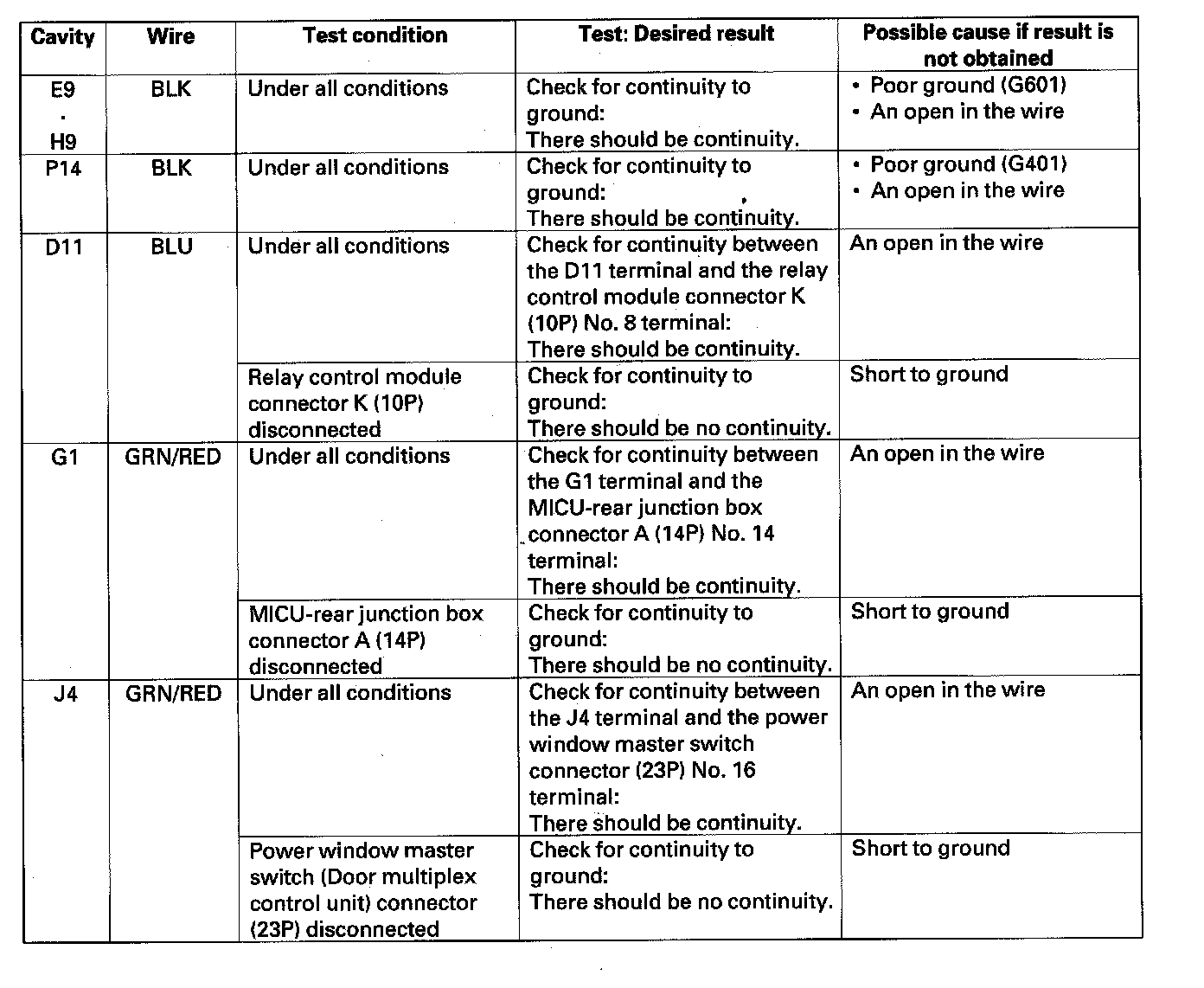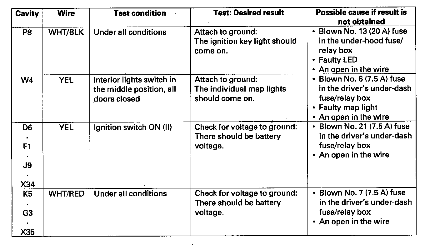 5. Reconnect the connectors to the driver's under-dash fuse/relay box, and make sure these input tests at the appropriate connectors on the driver's under-dash fuse/relay box.