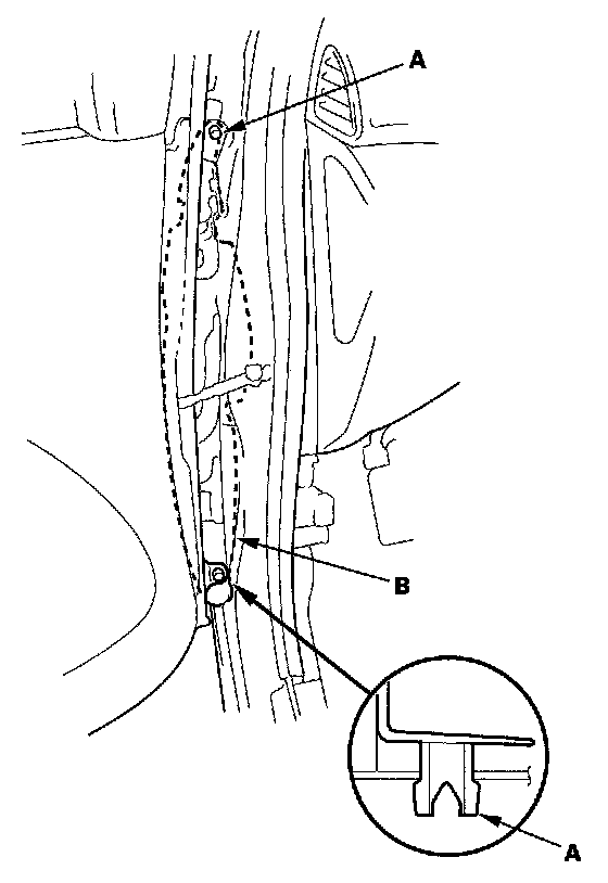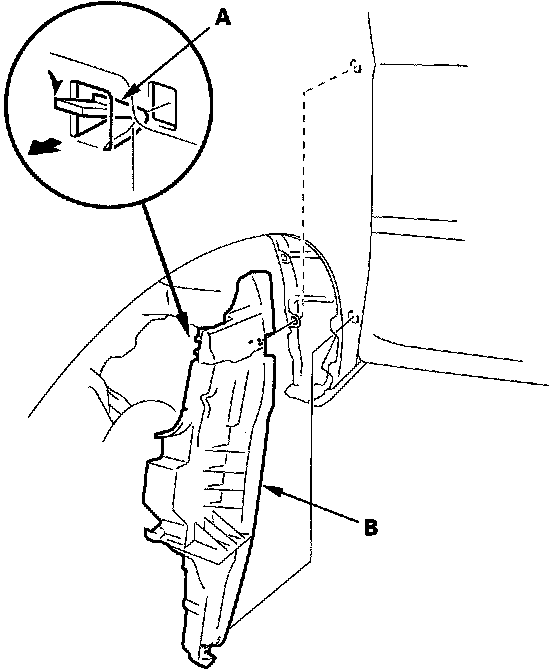 3. From inside the door, detach the hooks (A) securing the front fender fairing (B).
