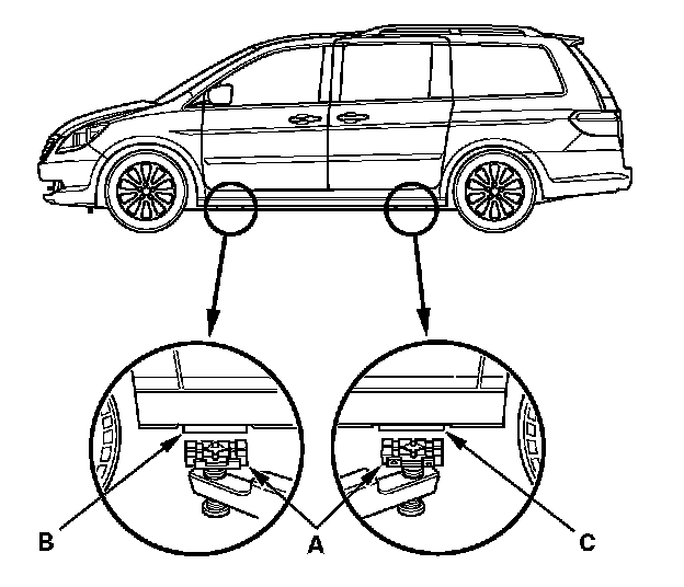 1. Position the hoist lift blocks (A), on safety stands, under the vehicle's front support points (B) and rear support points (C).