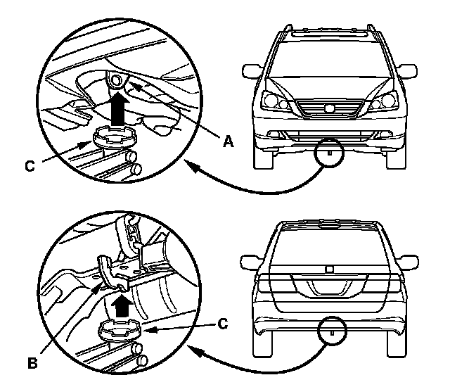 3. Position the floor jack under the front jacking bracket (A) or rear jacking bracket (B), center the jacking bracket in the jack lift platform(C) and jackup the vehicle high enough to fit the safety stands under it.