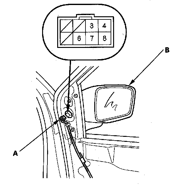 2. Disconnect the 8P connector (A) from the power mirror actuator (B).