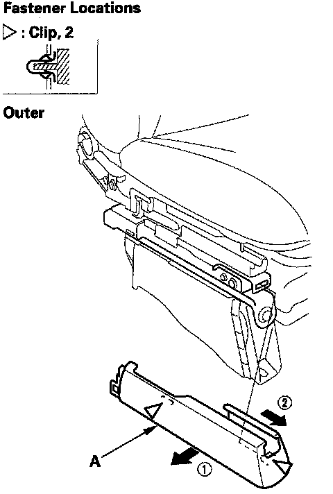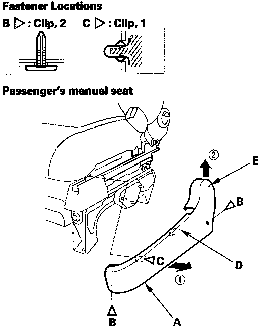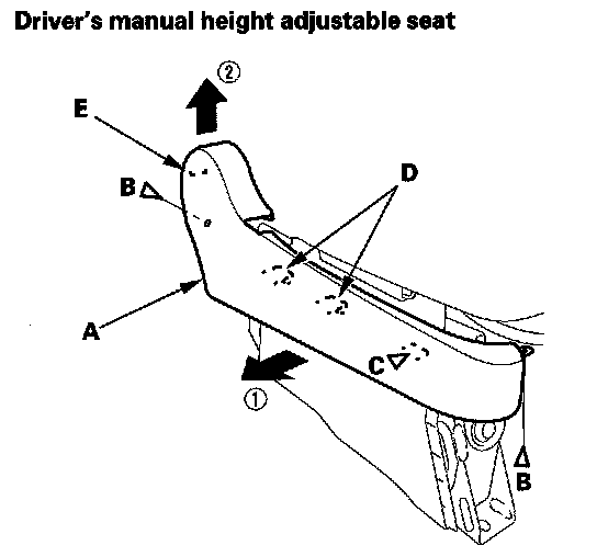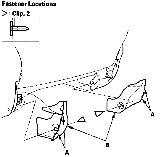2. Driver's 8-way power seat: Remove the clip and release the hooks (A), then remove the inner cover (B) from both sides.