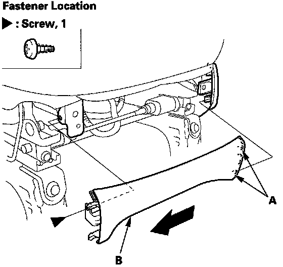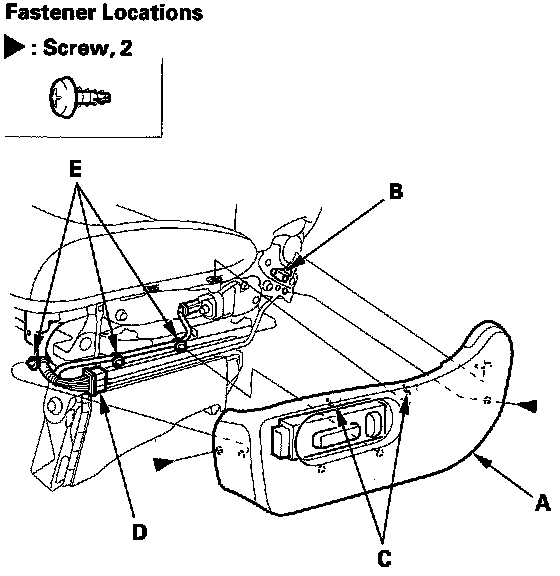 6. Driver's 8-way power seat: Remove the screw and release the hooks (A), then remove the front cover (B).