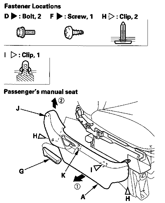 4. Detach the clip (I), and release the hooks (J, K) then remove the recline cover.