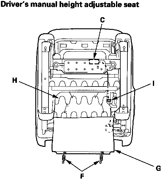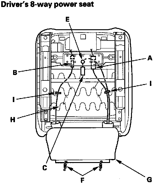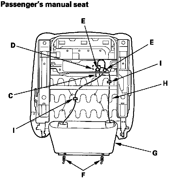 13. From under the seat cushion, disconnect the recline motor subharness connector (A), and if equipped, the seat-back heater connector (B) on the driver's 8-way power seat. Detach the side airbag connector clip (C), the OPDS unit connector clip (D) on the passenger's seat, and harness clip (E). Release the hook springs (F) and seat cushion cover (G) from the seat cushion frame spring (H), then pull the cover back, and remove the wire ties (I).