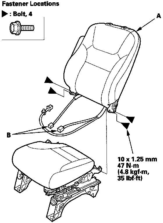 10. Driver's 8-way power seat: Remove the recline lower cover (A) and center lower cover (B).