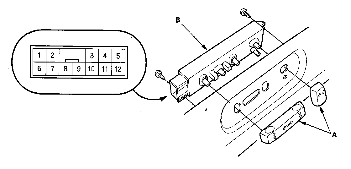 1. Remove the power seat adjustment switch knobs (A) and recline cover from the driver's power seat, then remove the two screws and the power seat adjustment switch (B).