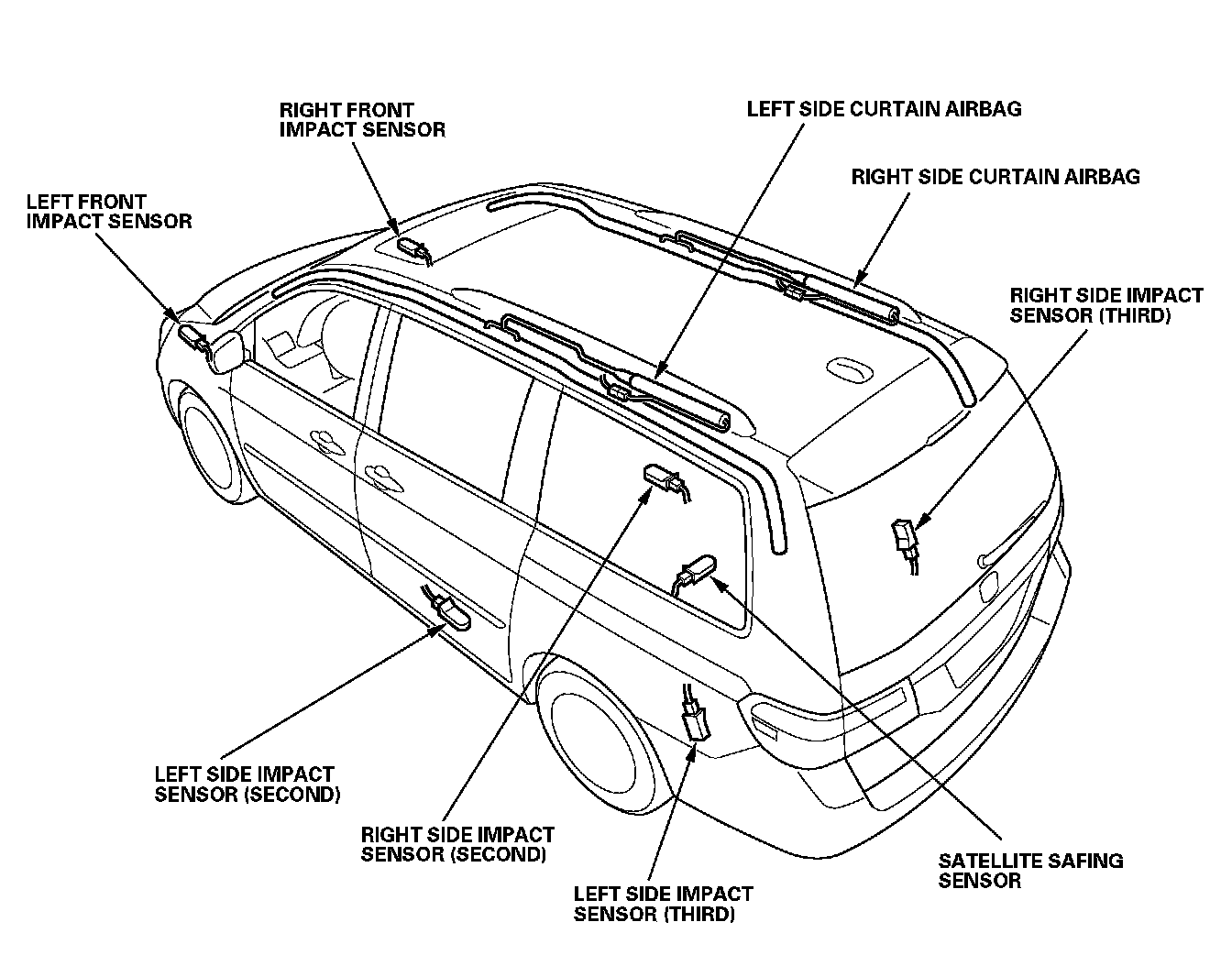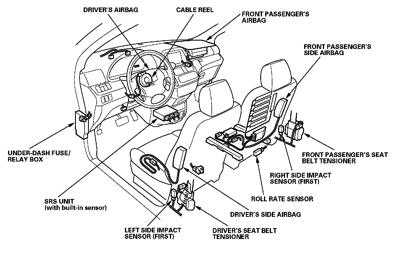 Supplemental Restraint System (SRS)This model has an SRS which includes a driver's airbag in the steering wheel hub, a passenger's airbag in the dashboard above the glove box, seat belt tensioners in the front seat belt retractors, side airbags in the front seatbacks, and side curtain airbags in the side of the roof side. The SRS unit is separate form the airbag assembly and has built-in sensors. The following precautions should be observed when performing sheet metal work, paint work, and repair work around the locations of the SRS components.