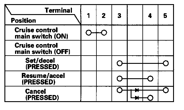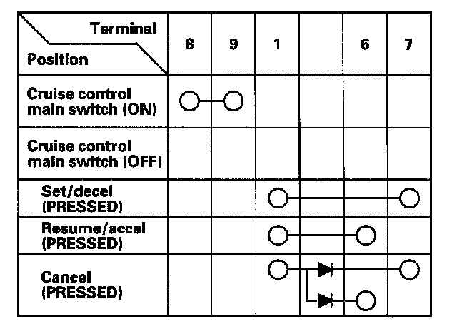 - If there is continuity, and it matches the table, but switch failure occurred on the cruise control input test, check and repair the wire harness on the switch circuit.