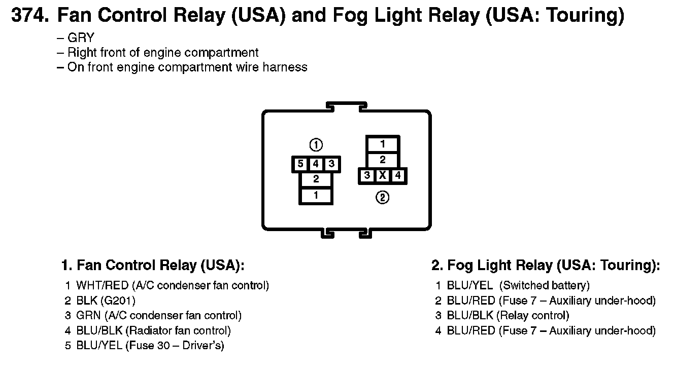 374. Fan Control Relay (USA) and Fog Light Relay (USA:Touring):