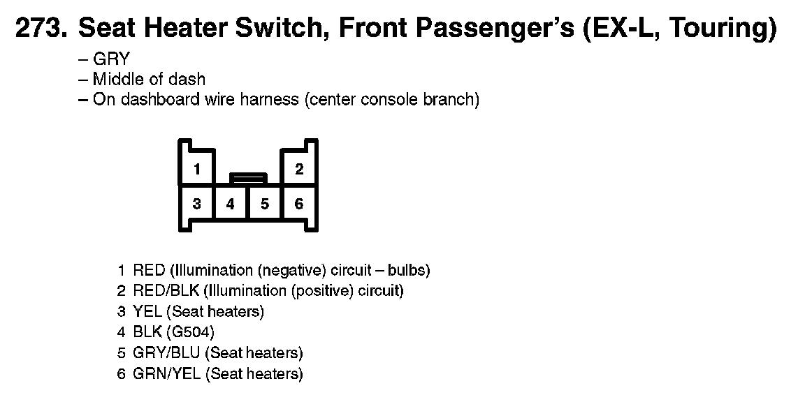 273. Seat Heater Switch, Front Passenger's (EX-L, Touring):