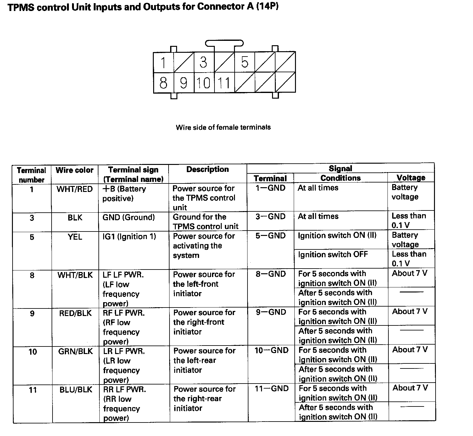 TPMS control Unit Inputs and Outputs for Connector A (14P):