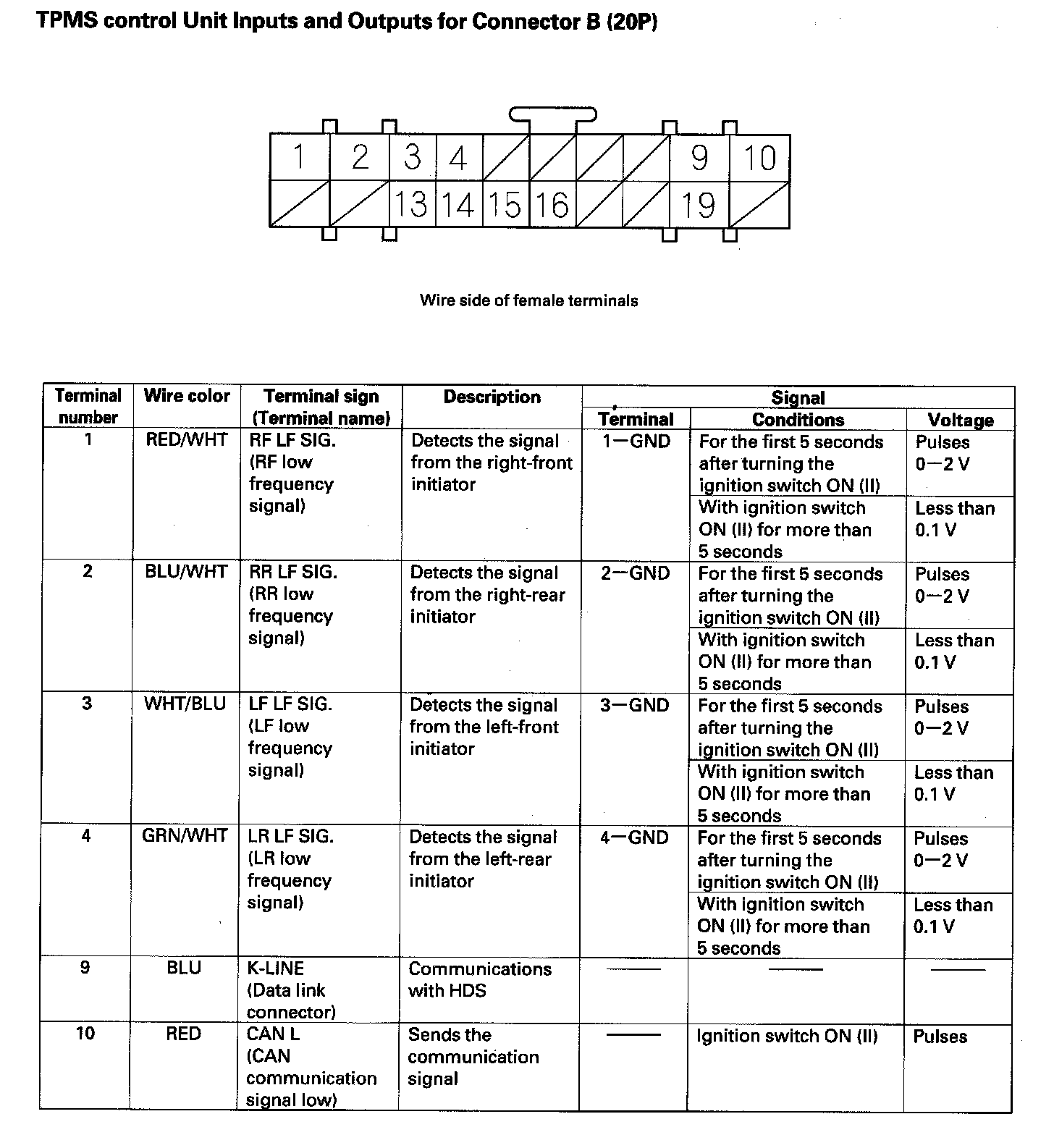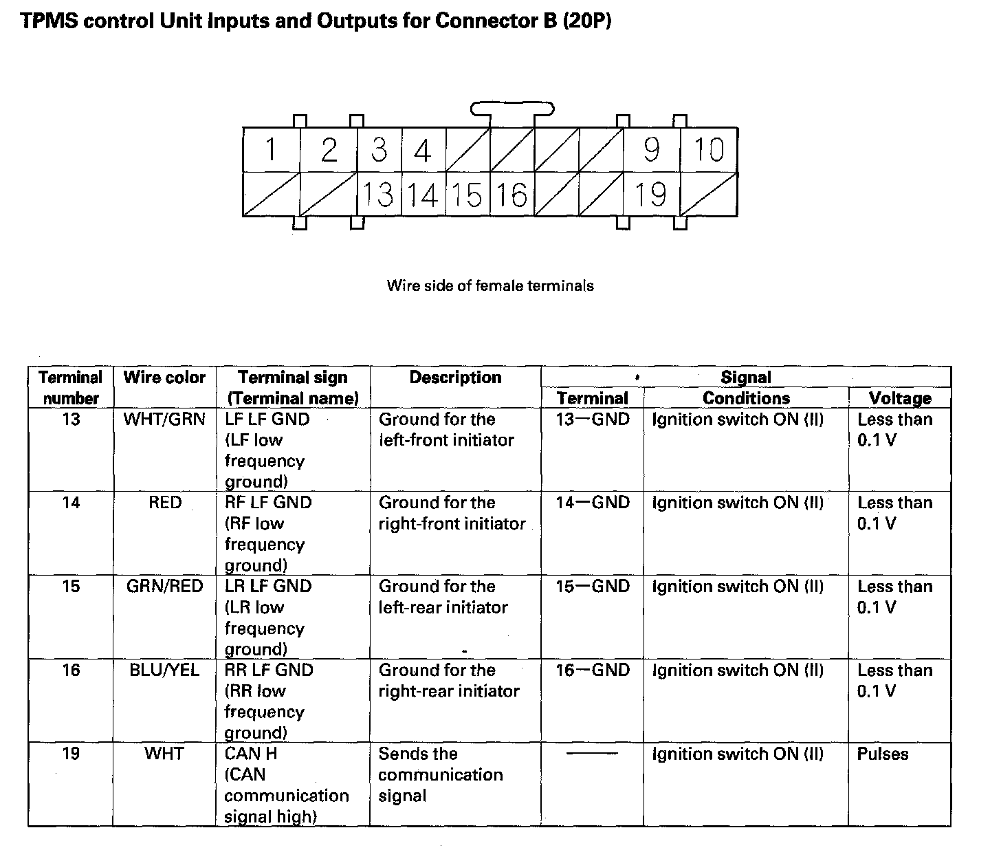 TPMS control Unit Inputs and Outputs for Connector B (20P) (Part 1):