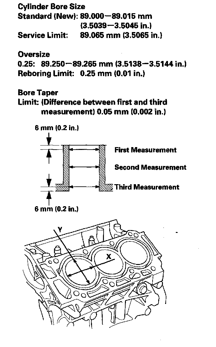 4. Measure wear and taper in direction X and Y at three levels in each cylinder as shown. If measurements in any cylinder are beyond the oversize bore service limit, replace the engine block. If the engine block has to be rebored, refer to step 7 after reboring.