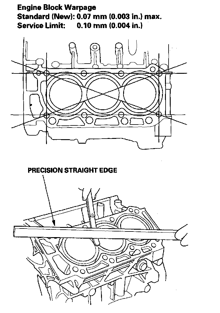 6. Check the top of the engine block for warpage. Measure along the edges and across the center as shown.