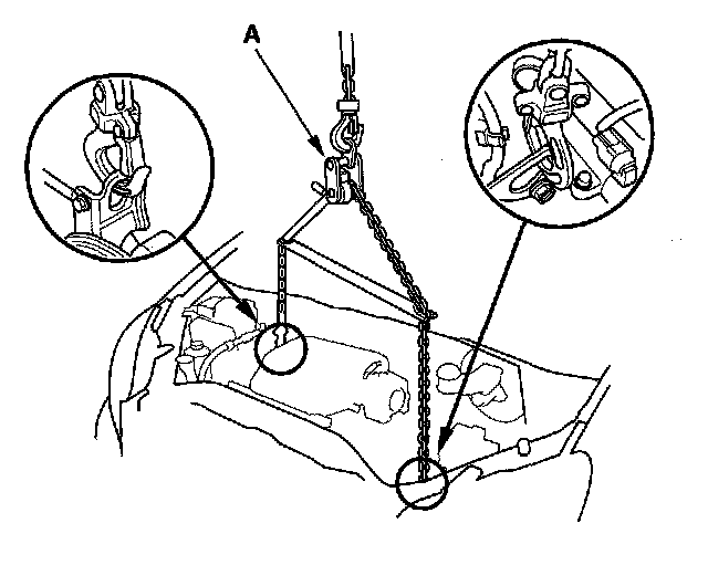 2. Position the engine/transmission under the vehicle. Be sure that they are properly aligned. Carefully lower the vehicle until the engine/transmission are properly positioned in the engine compartment. Make sure the vehicle is not resting on any part of the engine/transmission. Support to the engine/transmission with a chain hoist (A) and carefully raise the engine/transmission into place.