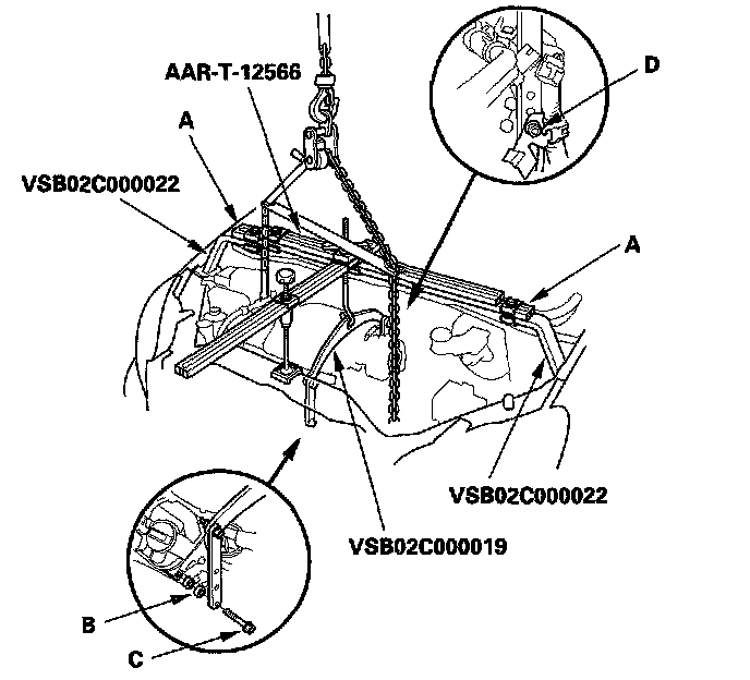 3. Install the engine hanger adapters (VSB02C000022) on the end of the engine support beams (A), then install the engine support hanger (AAR-T-12566) with the adapters to the vehicle.