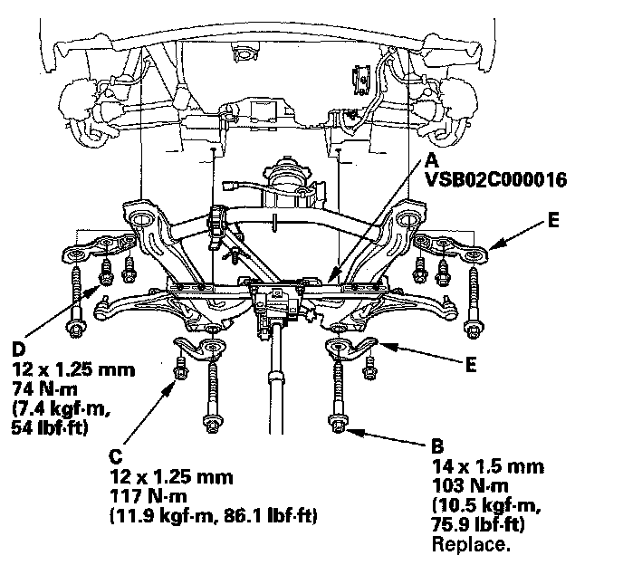 8. Loosely install the new front subframe mounting bolts (four) (B), the 12 x 1.25 mm bolts (six) (C) (D), and the stiffeners (E).