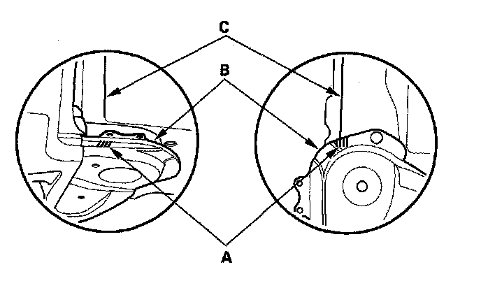 45. Align the reference mark (A) on the steering joint and steering gearbox pinion shaft. Connect the steering joint (B) to the steering gearbox pinion shaft (C). Tighten the steering joint bolt.