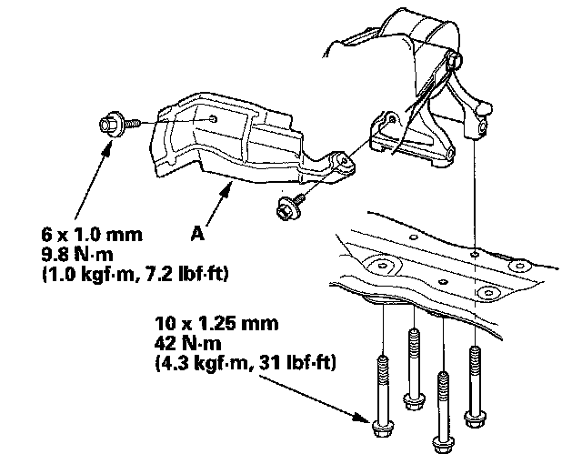 12. J35A6 engine: Tighten the rear engine mount bolt, then install the heat shield (A).