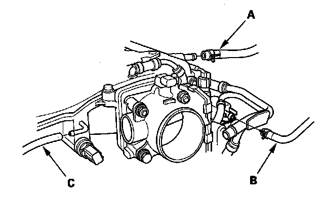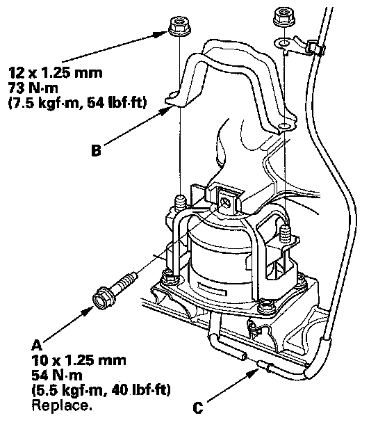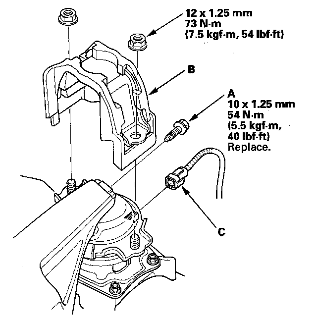 15. J35A6 engine: Tighten the front engine mount bolt (A), then install the front engine mount stop (B) and front engine mount control solenoid valve tube (C).