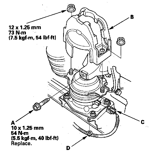 16. J35A7 engine: Tighten the front engine mount bolt (A), then install the front engine mount stop (B), and connect the front ACM actuator connector (C) and harness clamp (D).