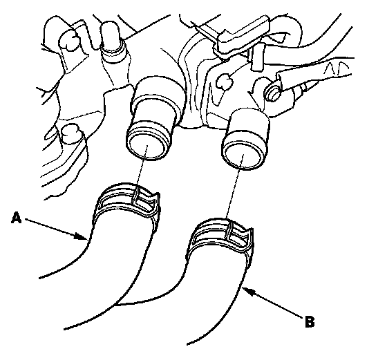 24. Install the upper radiator hose (A) and lower radiator hose (B).