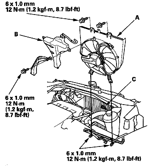 25. Install the A/C condenser fan shroud (A), and coolant reservoir (B), then connect the fan motor connector (C).