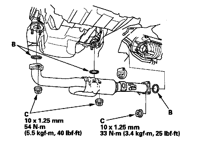 33. Install exhaust pipe A using new gaskets (B) and new self-locking nuts (C).