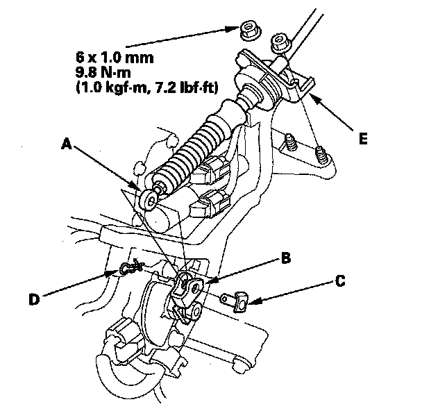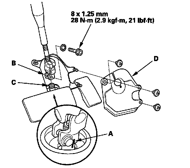 37. Attach the shift cable end (A) to the control lever (B), then insert the control pin (C) into the control lever hole through the shift cable end, and secure the control pin with the snap pin (D). Do not bend the shift cable excessively.