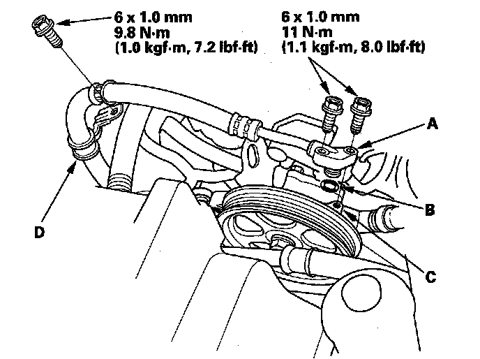 39. Install the power steering pump outlet hose (A) with a new O-ring (B) to the pump (C), then secure the hose clamp using the bracket (D).