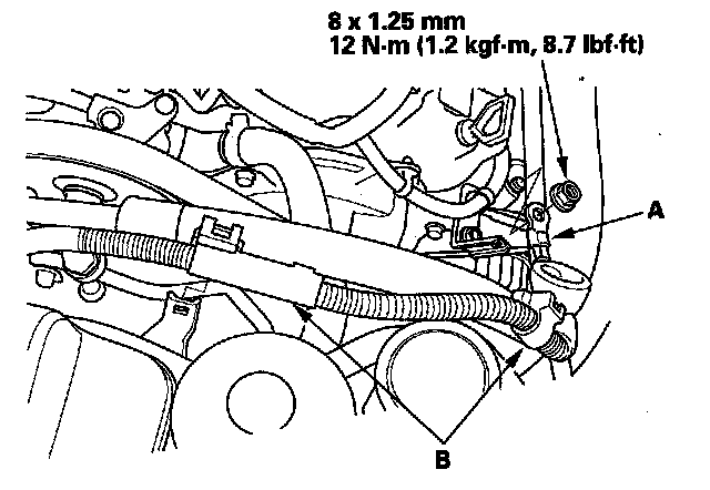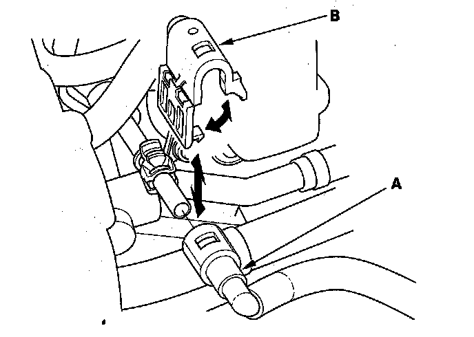 49. Install the brake booster vacuum hose (A), evaporative emission (EVAP) canister hose (B).