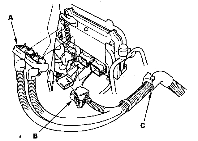 43. Connect the engine wire harness connectors (A) and cabin wire harness connector (B), then install the harness clamp (C).