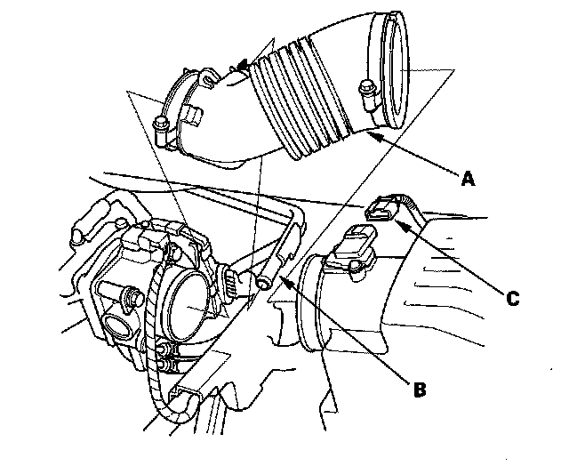55. Install the air intake duct (A), then install the breather pipe (B), then connect mass air flow (MAF) sensor connector (C).