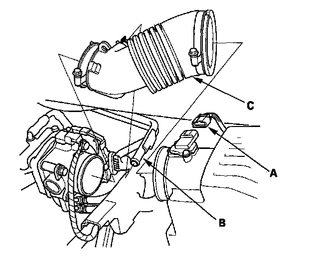9. Disconnect mass air flow (MAF) sensor connector (A), then remove the breather pipe (B), then remove the air intake duct (C).