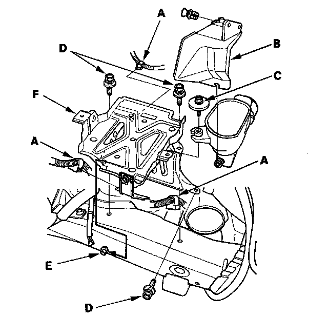 12. Remove three mounting bolts (D) and loosen the mounting bolt (E), then remove the battery base (F).