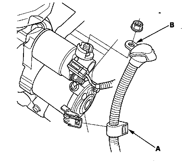 13. Remove the harness clamp (A) and the starter cable (B) from the B terminal.